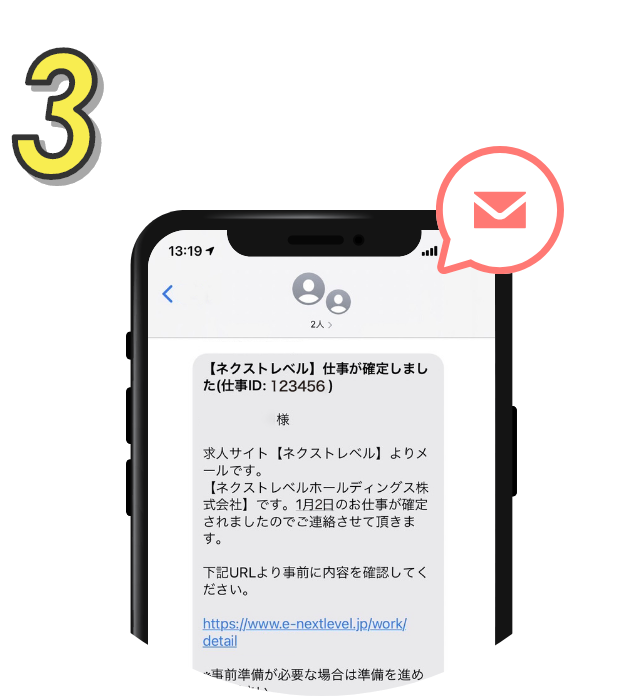 当社が就業予定者の皆様に前日に最終確認のメール、電話で確認を致しますが、2時間以内に当社への返信・返答がない場合は、今回ご紹介したワーカーとして就業頂くお仕事に基づく、当社と皆様との労働契約は不成立といたします。